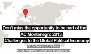 The International Association for Political Science Students along is inviting you to be part of the 6th IAPSS Academic Conference. The Academic Conference will take place from September 27th to October 1st 2013 in Budva, Montenegro.