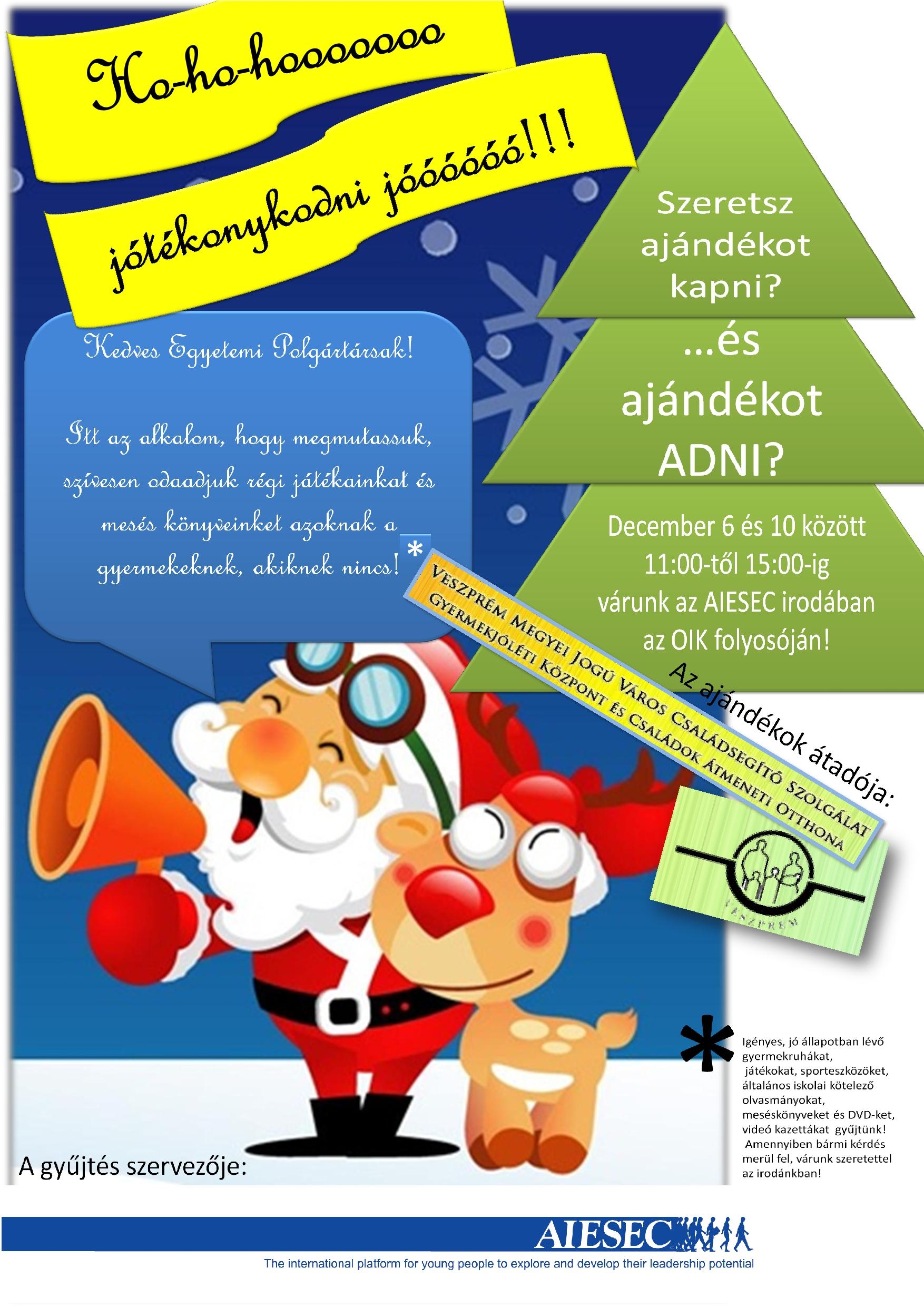 Leginkább jó minőségben megmaradt ruhákra, játékokra, sporteszközökre, általános iskolai kötelező olvasmányokra, készségfejlesztőkre, mesekönyvekre és mesés DVD-re, videokazettákra vágynak ezen a Karácsonyon az otthon apró lakói. Ha van otthon ezek közül bármid, amire neked már nincs szükséged, okozz örömet valakinek azzal, hogy a szorgalmi időszak utolsó hetében behozod az AIESEC irodába (OIK mellett) 11 és 15 óra között! Ha bármi kérdésed felmerül az adományozással kapcsolatban, keress fel minket irodánkban!