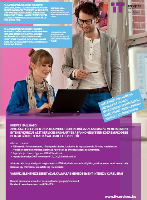 A kurzus már 2014-ben, a tavaszi félévben is indult, és büszkén mondhatjuk, hogy az ágazaton gyakornokaink közül többen a Pannon Egyetem hallgatói közül kerültek ki. A kurzus keretein belül megismerkedhetnek az alkalmazások menedzselésével kapcsolatos mindennapi teendőkkel, azok hátterével, gyakorlati példákon keresztül nyerhetnek betekintést ebbe a sokrétű szakmába.