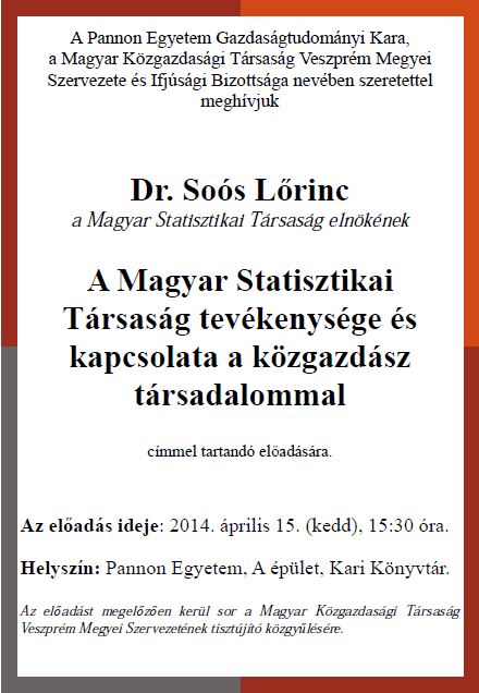A Pannon Egyetem Gazdaságtudományi Kara, a Magyar Közgazdasági Társaság Veszprém Megyei Szervezete és Ifjúsági Bizottsága nevében szeretettel meghívjuk Dr. Soós Lőrinc, a Magyar Statisztikai Társaság elnökének „A Magyar Statisztikai Társaság tevékenysége és kapcsolata a közgazdász társadalommal” címmel tartandó előadására.