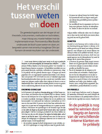 Habár beszerzéssel kapcsolatos elméletek, eszközök, módszerek és technikák tárháza áll a menedzserek rendelkezésére, a gyakorlatban ezek nem mindig hasznosulnak. Max Boodie, PhD hallgató és Prof. Dirk-Jan Kamann bemutatják kutatásuk első eredményeit, mely során megvizsgálták az elmélet és a gyakorlati alkalmazás közötti különbséget, a Deal! című holland folyóiratban, melyet több mint 6000 gyakorló beszerzési szakember olvas. A cikk feltárta, hogy a megkérdezett beszerzési menedzserek 30%-a ismeri az összes elméleti koncepciót, de nem alkalmazza azokat. A cikk kitér ennek okaira és javaslatokat fogalmaz meg arra vonatkozóan, hogy hogyan lehet a tudás és a gyakorlat közötti rést csökkenetni. A szerzők javasolják, többek között, a beszerzési menedzserek és a belső ügyfelek humán erőforrás ösztönzőinek kiigazítását, valamint a belső ügyfelek ötleteinek jobb megismerését.