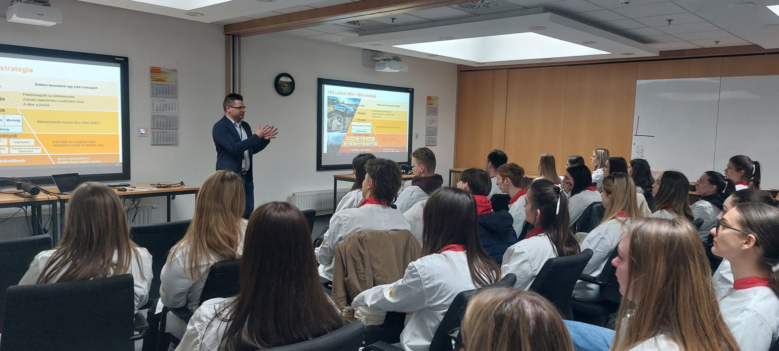 Farkas Pál termelési felsővezető gyárbemutató prezentációja után a hallgatók érdekfeszítő termelési üzembejáráson vettek részt vezető mérnökök kíséretében.